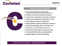 Visitors open an album by entering an album name in their browser, clicking through from a website link or directly from an email. Albums can be set to open in different views such as thumbnail summary view or full screen. Visitors can manually step through screens or run an automatic slideshow. If enabled, visitors can download individual images at high resolution for making quality prints at their preferred photo finisher. Show off your personal photos or describe your business products with high impact, full screen resolution images.